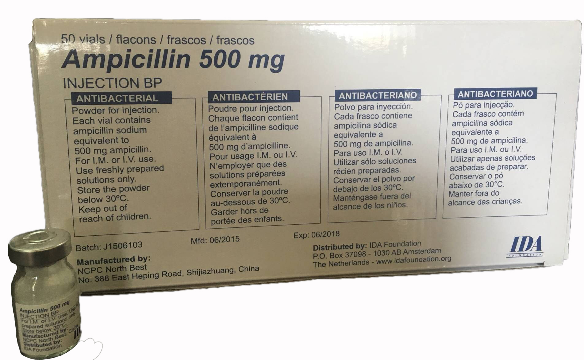 Antibacterial Powder for injection. Each vial contains ampicillin sodium equivalent to 500mg ampicillin. For I.M. or I.V. use. Use freshly prepared solutions only. Store the powder below 30℃. Keep out of reach of children.
